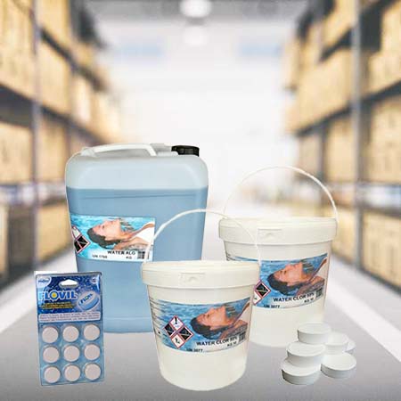Cloro, Dicloro, Tricloro e Alghicida in vari formati, in base al prodotto:...